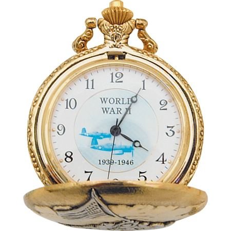 Infinity Pocket Watches, Infinity Pocket Watches - WWII Pocket Watch with White Face & Black Hands & Image of Fighter Aircraft. Model: IW39. Gold finish sculpted cast metal case with image of flag raising on Iwo Jima. Second hand. Japanese quartz movement. Gold finish metal chain. Gift boxed.